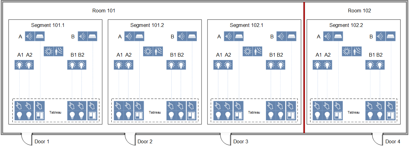 Scenario: You have two rooms, each with 2 segments, controlled by the operator panel on the applicable door. Moving the separating wall creates a room with 3 segments and one room with 1 segment. Only the individual, applicable segment can be controlled by the operator panel on the door.